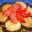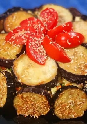 Saya memotong terong menjadi lingkaran, lalu menaburinya dengan garam.Saya gulingkan beberapa terong dalam tepung kanji dan goreng kedua sisinya dengan minyak. Saya meletakkannya di atas tisu dapur. Saya gulingkan beberapa